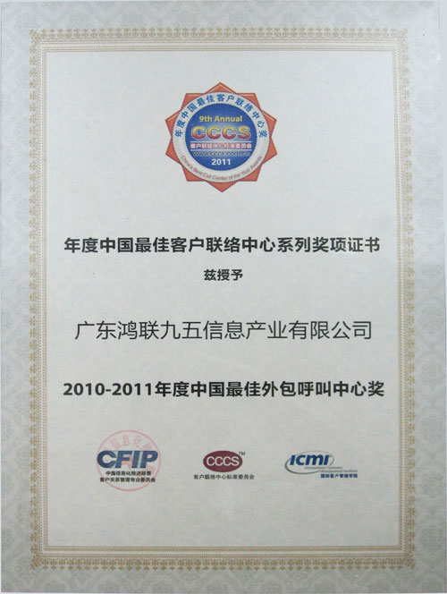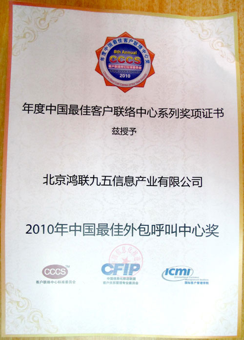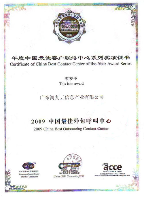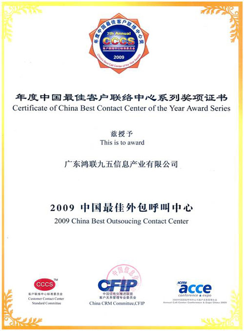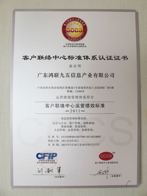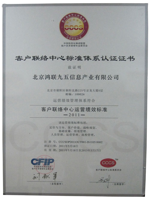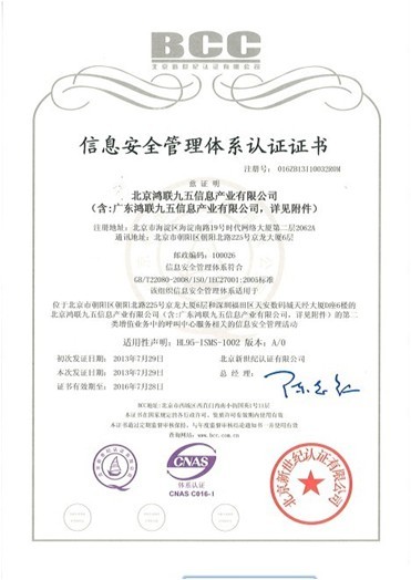 鴻聯(lián)九五經(jīng)歷多年的運營管理優(yōu)化,不斷的通過各類體系和權(quán)威的認(rèn)證,如 ISO27001 安全管理體系認(rèn)證、ISO9001 質(zhì)量管理體系認(rèn)證、ISO14001 環(huán)境管理體系認(rèn)證、ISO22301業(yè)務(wù)連續(xù)性管理體系認(rèn)證、ISO27701 隱私信息管理體系認(rèn)證和 OHSAS18001職業(yè)健康安全管理體系認(rèn)證等。目前已獲得行業(yè)的認(rèn)可和肯定,成為通信行業(yè)、呼叫協(xié)會、人力資源行業(yè)的理事單位。連續(xù)多年榮獲中國最佳外包服務(wù)商獎,2017年榮獲北京市海淀區(qū)中關(guān)村質(zhì)量獎,除此之外,鴻聯(lián)九五還廣泛受到客戶的認(rèn)可與肯定,收到多家合作伙伴的表揚信、優(yōu)秀供應(yīng)商獎等。