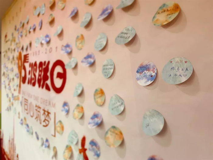 今年鴻聯日的主題為“同心筑夢”,集團總部精心布置了熱氣球和云朵,并在95鴻聯日的前一天收集了小鴻人們的夢想,貼在裝飾背景墻的天空中。“希望鴻聯業(yè)務蒸蒸日上”“與鴻聯一同成長一同奮進”“穩(wěn)步發(fā)展,早日上市”“鴻聯邁進500強”……一個個夢想在這里放飛,一個個心愿也將在這里實現。