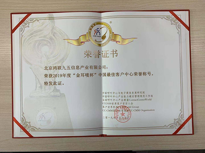 北京鴻聯(lián)九五信息產(chǎn)業(yè)有限公司榮獲2019年度“金耳嘜杯”中國(guó)最佳客戶中心榮譽(yù)稱號(hào)